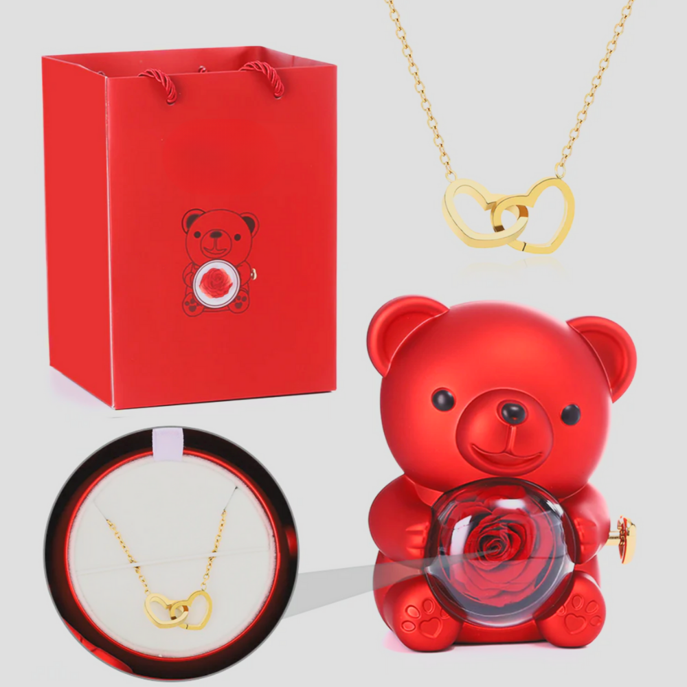 A Forgó Maci pontosan ezt nyújtja: több mint dekoráció, érzelmes üzenet, meglepetésbe csomagolva. Először megjelenik a rózsa — a gyengédség és odafigyelés jelképe. Aztán egy mozdulattal feltárul a nyaklánc — maradandó emlékeztető a kapcsolatotokra és közelségetekre.