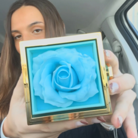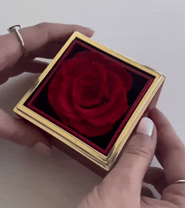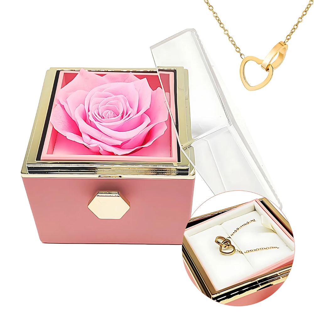 A díszdoboz kék rózsája alatt egy gyengéd meglepetés rejtőzik – két egybefonódó szívet ábrázoló nyaklánc, amely elvarázsolja azt, aki megkapja. A kis oldalkar elforgatásával feltárul ennek az elegáns ajándéknak a titka, mely egy mozdulattal egyesíti a szeretet és törődés szimbolikáját.